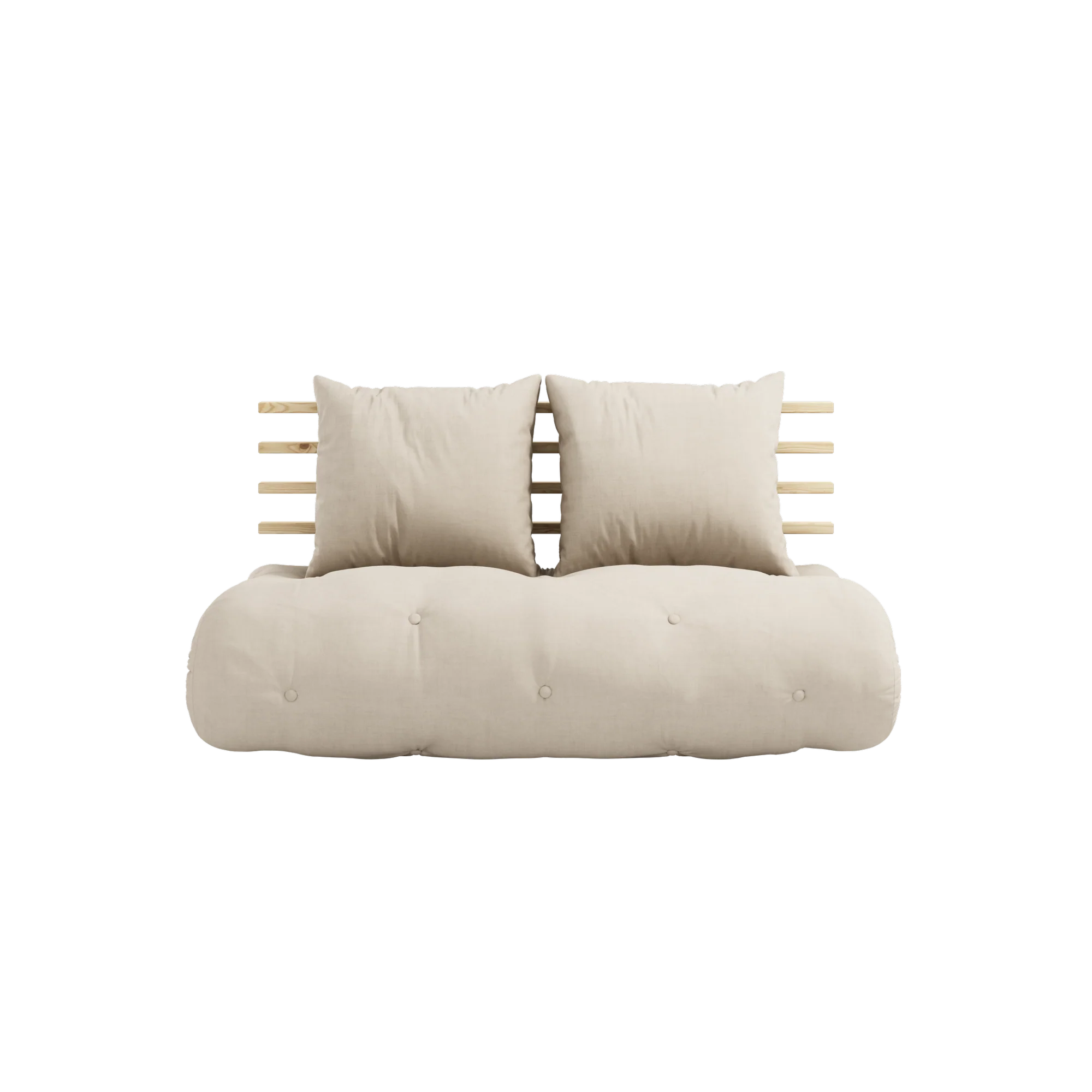 Shin Sano features a comfortable, thick futon mattress surrounded by a stylish, slatted frame at the back. Pull the futon out flat and in seconds you'll have a lovely, twin guest bed with a headboard and two comfy cushions to lean against. Shin Sano also works well as a sofa bed for the times when you just want to relax at home.